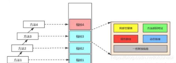 - java虚拟机栈(Java Virtual Machine Stack),早期也叫Java栈。每个线程在创建时都会创建一个虚拟机栈,其内部保存一个个栈帧,对应这个一次次的 java调用。他是线程私有的