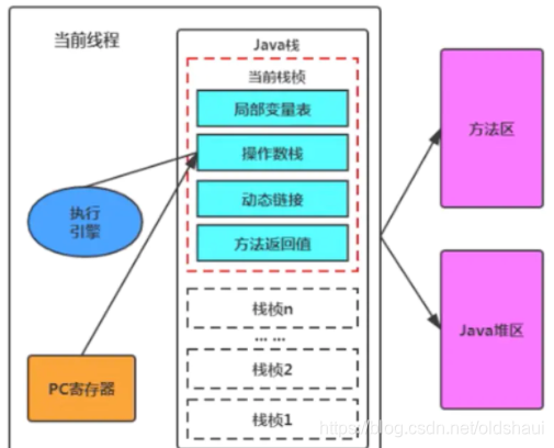 - 在一条活动线程中,一个时间点上,只会有一个活动的栈帧。即只有当前正在执行的方法的栈帧(栈顶栈帧)是有效的,这个栈帧被称为当前栈帧(Current Frame),与当前栈帧对应的方法就是当前方法(Current Frame)