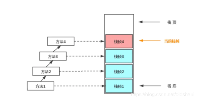 - 如果再该方法中调用了其他方法,对应的新的栈帧就会被创建出来,放在栈的顶端,成为新的当前栈帧