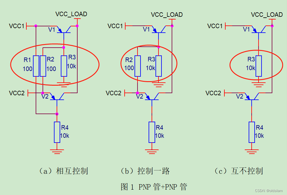 综上述:图1(a)两路电源压差大于VEB,即|VCC1-VCC2|>VEB,且分压电阻阻值满足R4>>R1(让基极获得几乎全部VCC1电压,控制另外一路的基极),实现两路电源切换正常,但会存在倒灌电流至另外一路电源;反之会处于不稳定状态;图1(b)电路无法实现两路电源切换:只能一路电源优先使用,另外一路非饱和导通;图1(c):V1管或V2管存在倒置状态,容易造成电流倒灌,难于实现两路电源切换。