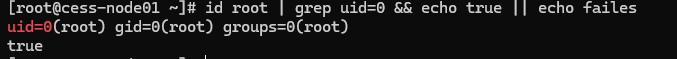 id root | grep uid=0 && echo true || echo failes