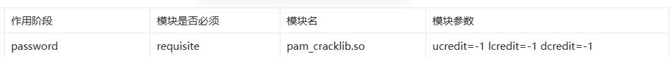 | 解释: | 模块作用阶段: 密码更改时。 | 一票否决 | PAM 的一个模块,专门用于检查密码的复杂度。 | + ucredit=-1 密码中至少1个大写字母。 + lcredit=-1 密码中至少1个小写字母 + dcredit=-1 密码中至少1个数字。 + ocredit=-1 密码中至少一个特殊字符 |