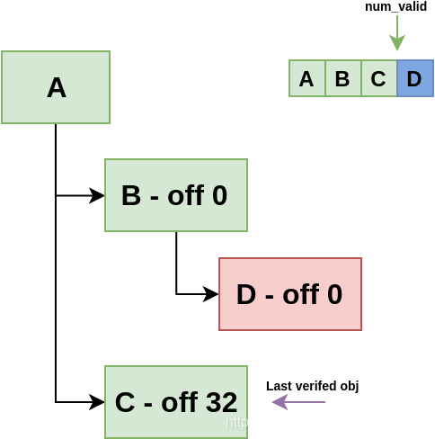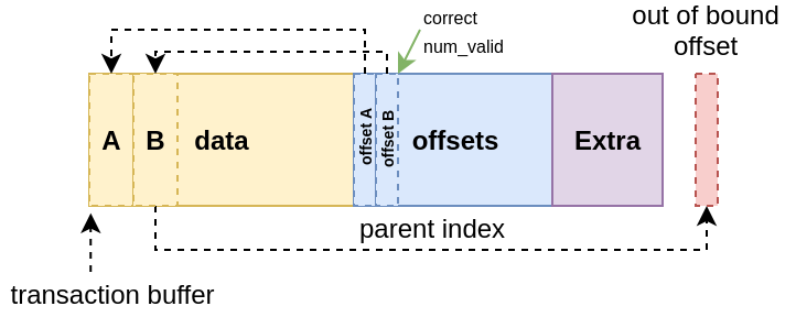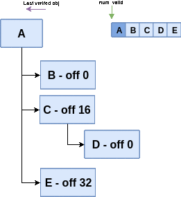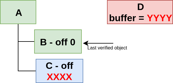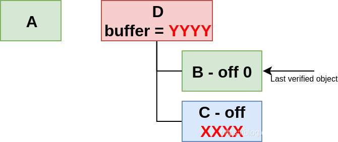 该图显示了算法的状态。 内核已经检查了缓冲区A和B ,但未检查对象C。 此时, parent_index的偏移量值尚未修改(设置为与offset A对应的值),并且最后一个验证的对象为B。