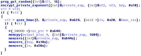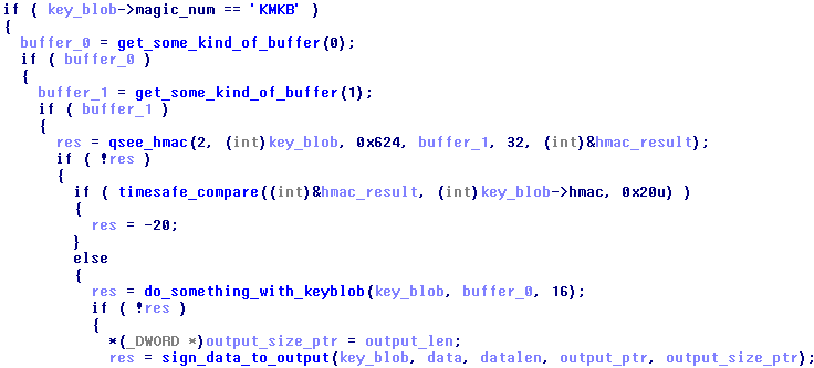 First of all, we can see that the code calls some function which I've taken the liberty of calling get_some_kind_of_buffer, and stores the results in the variables buffer_0 and buffer_1. Immediately after retrieving these buffers, the code calls the qsee_hmac function in order to calculate the HMAC of the first 0x624 bytes of the user-supplied key blob. This makes sense, since the size of the key blob structure we've seen before is exactly 0x624 bytes (without the HMAC field).