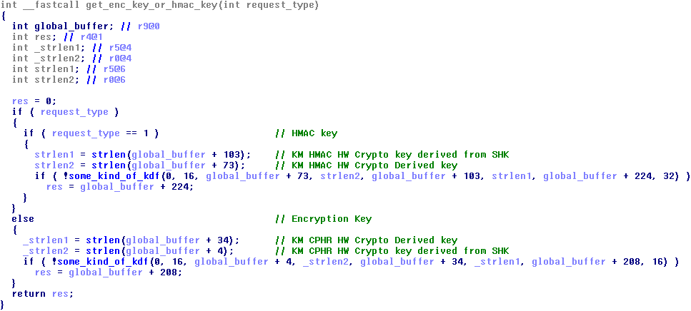 As we can see in the code above, the HMAC key and the encryption key are both generated using some kind of key derivation function. Each key is generated by invoking the KDF using a pair of hard-coded strings as inputs. The resulting derived key is then stored in the KeyMaster application's global buffer, and the pointer to the key is returned to the caller. Moreover, if we are to trust the provided strings, the internal key derivation function uses an actual hardware key, called the SHK, which would no doubt be hard to extract using software...