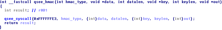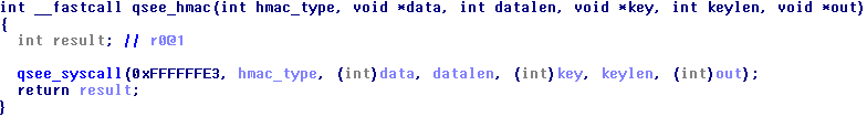 - The qsee_hmac function is not called very often, so hijacking it for a couple of seconds would probably be harmless.