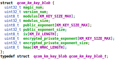 First, we can see that the key blob contains the unencrypted modulus and public exponent of the generated RSA key. However, the private exponent seems to be encrypted in some way. Not only that, but the whole key blob's authenticity is verified by using an HMAC. So where is the encryption key stored? Where is the HMAC key stored? We'll have to reverse-engineer the KeyMaster module to find out.