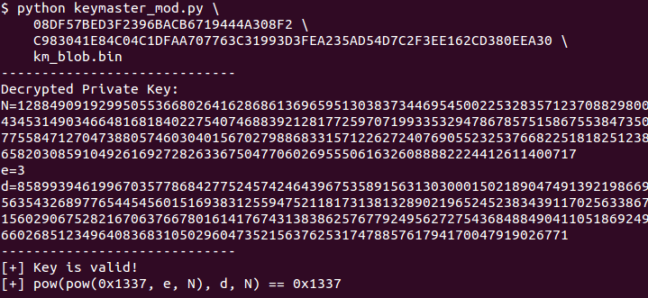Lastly, I've also written a script which can be used to decrypt already-generated KeyMaster key blobs. If you simply have a KeyMaster key blob that you'd like to decrypt using the leaked keys, you can do so by invoking the script km_keymaster.py, like so: