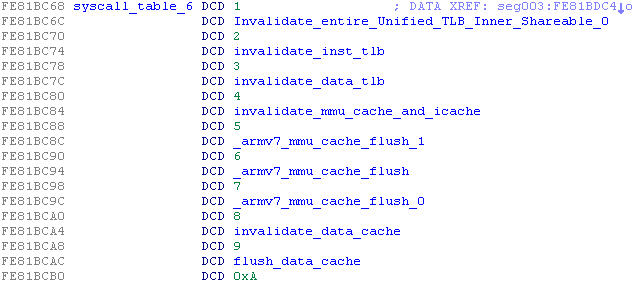 Recall that in the previous blog post we reverse-engineered the mechanism behind the invocation of system calls in the TrustZone kernel. Doing so revealed that most system-calls are invoked indirectly by using a set of globally-stored pointers, each of which pointing to a different table of supported system-calls. Each system-call table simply contained a bunch of consecutive 64-bit entries; a 32-bit value representing the syscall number, followed by a 32-bit pointer to the syscall handler function itself. Here is one such table: