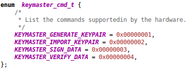 First, let's take a look at the Android source code which is used to interact with the KeyMaster application. Doing so reveals that the trustlet only supports four different commands: