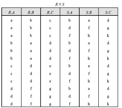 n目关系R、m目关系S,则二者的笛卡尔积是一个n+m目的元组集合,前n属于R,后m属于S,记作RXS,其形式定义如下: