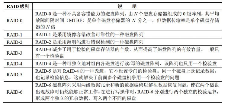 磁盘阵列是由多台磁盘存储器组成的一个快速、大容量、高可靠的外存子系统。现在常见的磁盘阵列称为廉价冗余磁盘阵列(Redundant Aray ofIndependent Disk,RAID)。目前,常见的 RAID 如下: