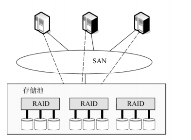 在大型服务器系统的背后都有一个网络,把一个或多个服务器与多个存储设备连接起来,每个存储设备可以是 RAID、磁带备份系统、磁带库和 CD-ROM 库等,构成了存储域网络(Storage Area Network,SAN)。
