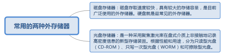 外存储器用来存放暂时不用的程序和数据,并且以文件的形式存储。CPU 不能直接访问外存中的程序和数据,只有将其以文件为单位调入主存才可访问。有如下种类: