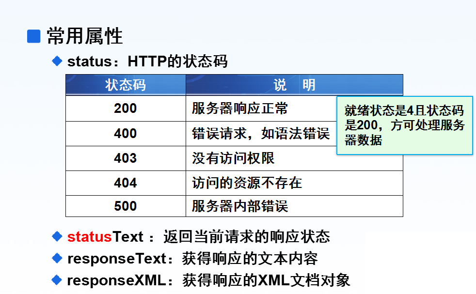 status属性描述了HTTP状态代码,注意,仅当readyState属性值为3(正在接受中)或者4(已加载)时,才能对此属性进行访问。如果在readyState属性值小于3时,试图去读取status属性值,将引发一个异常。