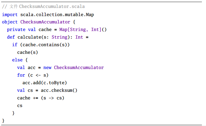 类和单例对象间的一个差别是,单例对象不带参数,而类可以。因为你不能用new关键字实例化一个单例对象,你没机会传递给它参数。每个单例对象都被作为由一个静态变量指向的虚构类:synthetic class的一个实例来实现,因此它们与Java静态类有着相同的初始化语法。