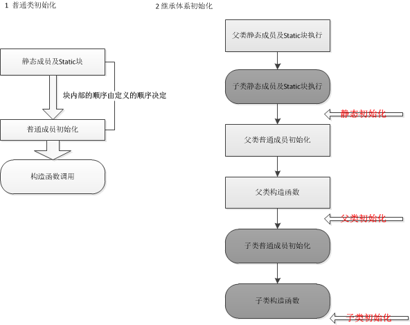 - 执行子类的构造代码块, 执行子类的构造函数,并初始化子类普通成员变量