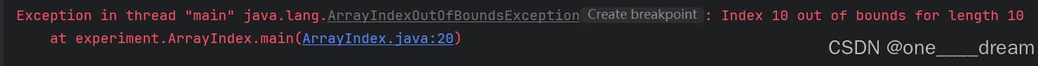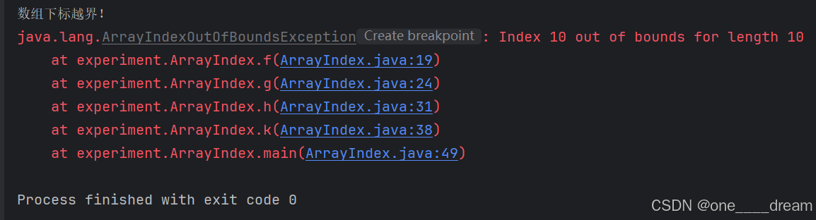 可以看到,程序出现了一个ArrayIndexOutOfBoundsException异常,这是因为长度为10的数组下标范围为0-9,而我对a[10]做了赋值,因此下标越界,此时产生的异常没有相应的处理程序,整个程序终止。