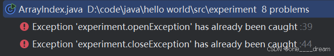 举个例子,若openException是Exception的子类,则第一条语句写了catch(Exception e),下面就不能再写catch(openException e)了,因为第一条就一定会被捕捉到,第二条没有意义,如下: