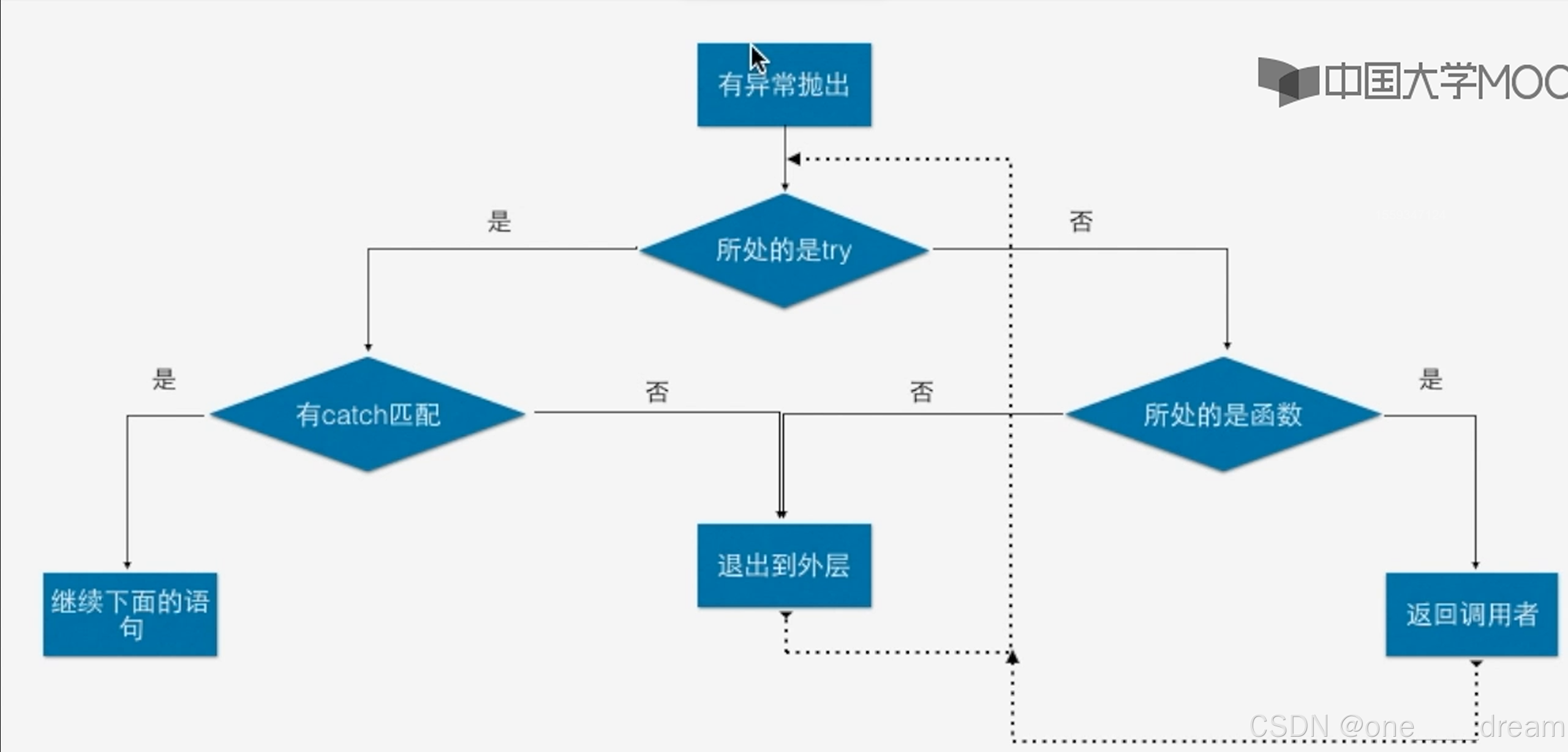 首先,我们要知道,如果在某函数中产生了一个异常,则产生异常的地方下面的所有代码都不会执行。那么,整个异常的传递和捕捉过程可总结为以下流程图