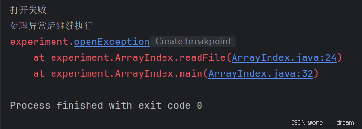 可见,我们自定义的openException异常从readFile函数抛出,并由main中的try-catch语句捕捉并处理。