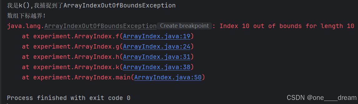 这里在main中调用k函数,k函数又调用h函数,h函数调用g函数,g函数调用f函数,最终在f函数里会产生一个 ArrayIndexOutOfBoundsException异常,但在k函数中只能捕捉NullPointerException异常,在main中才可以正确捕捉ArrayIndexOutOfBoundsException异常。