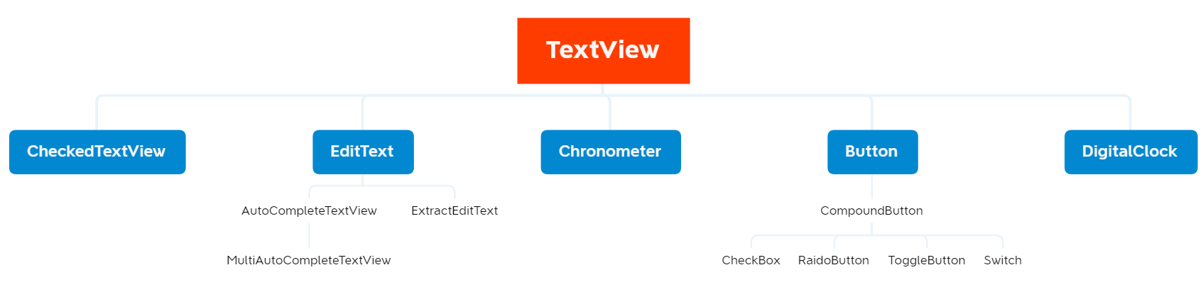 - 单选按钮(RadioButton)和复选框(CheckBox)、状态开关按钮(ToggleButton)与开关(Switch)都继承了Button类。