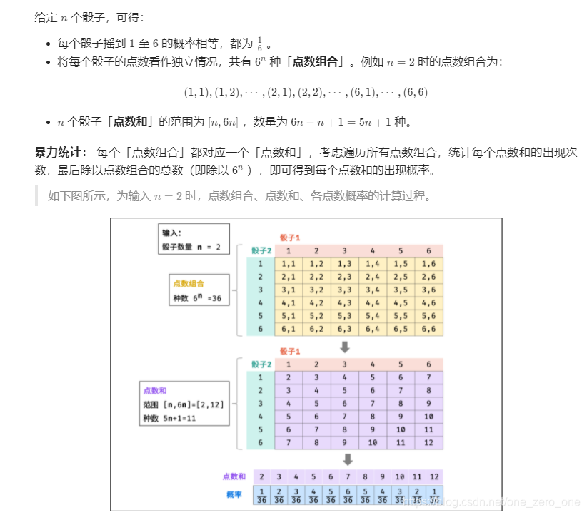 你需要用一个浮点数数组返回答案,其中第 i 个元素代表这 n 个骰子所能掷出的点数集合中第 i 小的那个的概率。