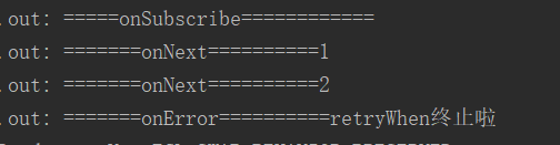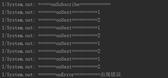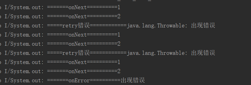 Observable.create(new ObservableOnSubscribe<Integer>() { @Override public void subscribe(ObservableEmitter<Integer> e) throws Exception { e.onNext(1); e.onNext(2); e.onError(new Throwable("出现错误")); } }) //重试次数 .retry(3) .subscribe(new Observer<Integer>() { @Override public void onSubscribe(Disposable d) { LogUtils.syso("=====onSubscribe============"); } @Override public void onNext(Integer integer) { LogUtils.syso("=======onNext=========="+integer); } @Override public void onError(Throwable e) { LogUtils.syso("=======onError=========="+e.getMessage()); } @Override public void onComplete() { LogUtils.syso("=======onComplete=========="); } });