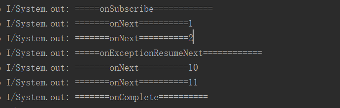 Observable.create(new ObservableOnSubscribe<Integer>() { @Override public void subscribe(ObservableEmitter<Integer> e) throws Exception { e.onNext(1); e.onNext(2); e.onError(new NullPointerException()); } }).onExceptionResumeNext(new Observable<Integer>() { @Override protected void subscribeActual(Observer<? super Integer> observer) { LogUtils.syso("=====onExceptionResumeNext============"); observer.onNext(10); observer.onNext(11); observer.onComplete(); } }).subscribe(new Observer<Integer>() { @Override public void onSubscribe(Disposable d) { LogUtils.syso("=====onSubscribe============"); } @Override public void onNext(Integer integer) { LogUtils.syso("=======onNext=========="+integer); } @Override public void onError(Throwable e) { LogUtils.syso("=======onError=========="+e.getMessage()); } @Override public void onComplete() { LogUtils.syso("=======onComplete=========="); } });