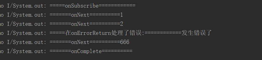 Observable.create(new ObservableOnSubscribe<Integer>() { @Override public void subscribe(ObservableEmitter<Integer> e) throws Exception { e.onNext(1); e.onNext(2); e.onError(new Throwable("发生错误了")); } }).onErrorReturn(new Function<Throwable, Integer>() { @Override public Integer apply(Throwable throwable) throws Exception { LogUtils.syso("=====在onErrorReturn处理了错误:============"+throwable.getMessage()); return 666; } }).subscribe(new Observer<Integer>() { @Override public void onSubscribe(Disposable d) { LogUtils.syso("=====onSubscribe============"); } @Override public void onNext(Integer integer) { LogUtils.syso("=======onNext=========="+integer); } @Override public void onError(Throwable e) { LogUtils.syso("=======onError=========="); } @Override public void onComplete() { LogUtils.syso("=======onComplete=========="); } });