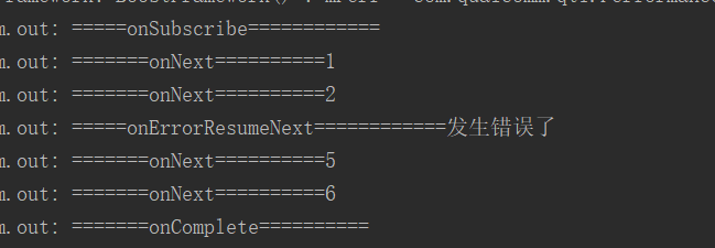 Observable.create(new ObservableOnSubscribe<Integer>() { @Override public void subscribe(ObservableEmitter<Integer> e) throws Exception { e.onNext(1); e.onNext(2); e.onError(new Throwable("发生错误了")); } }).onErrorResumeNext(new Function<Throwable, ObservableSource<? extends Integer>>() { @Override public ObservableSource<? extends Integer> apply(Throwable throwable) throws Exception { LogUtils.syso("=====onErrorResumeNext============"+throwable.getMessage()); return Observable.just(5,6); } }).subscribe(new Observer<Integer>() { @Override public void onSubscribe(Disposable d) { LogUtils.syso("=====onSubscribe============"); } @Override public void onNext(Integer integer) { LogUtils.syso("=======onNext=========="+integer); } @Override public void onError(Throwable e) { LogUtils.syso("=======onError=========="); } @Override public void onComplete() { LogUtils.syso("=======onComplete=========="); } });
