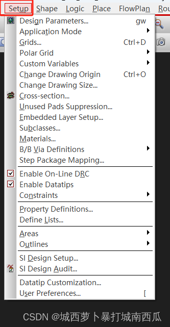 1.Design Parameters… 设置参数(显示钻孔、飞 线形式、图纸单位及大小、格点大小、字体大小、 铺铜参数等)
