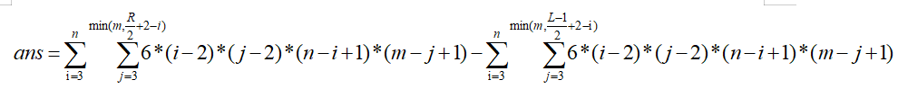 他称一种选择方案是好的,当且仅当L≤|x1-x2|+|y1-y2|+|x2-x3|+|y2-y3|+|x1-x3|+|y1-y3|≤R,即这三个黑格子之间两两的曼哈顿距离之和在区间[L,R]内。其中L,R是他给定的两个常数。