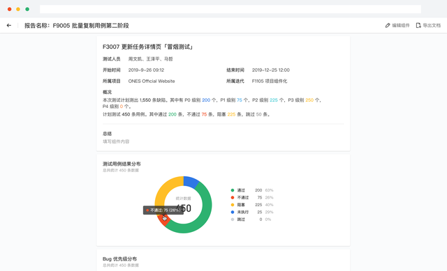 在完成测试计划之后,ONES Testcase可以一键生成测试质量报告,提供不同维度的分析结果。当测试质量报告的维度不能满足管理需求,还可以通过自定义模版的方式方便测试经理进行报告的管理
