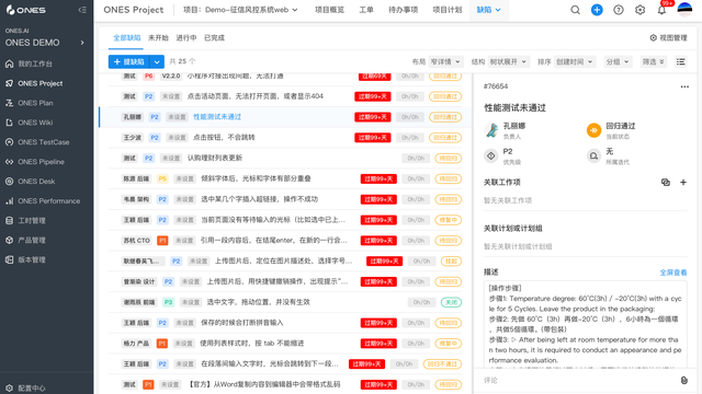 未通过测试的用例,可以转缺陷,提交至 ONES Project 。研发人员在接到测试提交的缺陷后,通过同时传回的缺陷记录回溯缺陷问题,复现缺陷,进行修复,直到重新提交,进行回归测试