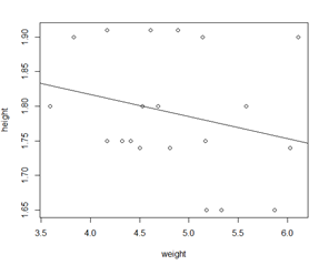 plot(d$weight,d$height,xlab="weight",ylab="height")