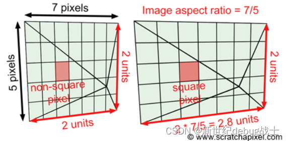 由于图像的宽高不同,屏幕的总像素空间并不是标准正方形。为了纠正这个问题,我们需要通过Image Aspect Ratio沿 x 轴缩放图像平面,该比例值可以通过将图像的height / width(以像素为单位)计算得出。