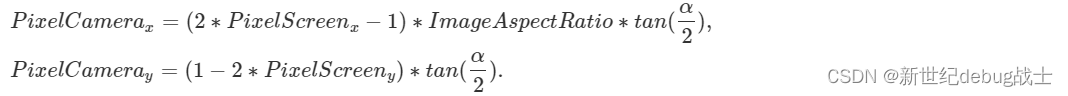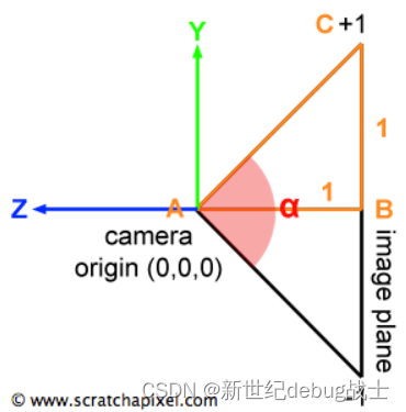 这个操作改变了我们看到的场景的多少,相当于放大(当fov减小时我们看到的场景更少,但像素长宽不变,遂相当于放大)和缩小(当fov增加时)。总之,我们可以根据角度 α 来定义相机的视野,并将屏幕像素坐标乘以tan(α/2)。