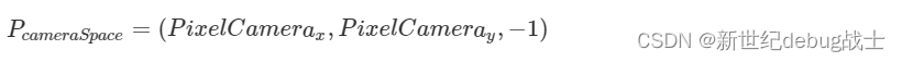 最终,这个点已经处于camera space中。 当camera在其默认位置时,camera坐标系和世界坐标系是对齐的。 该点位于距离camera原点 1 个单位的图像平面上,但请记住,相机也沿负 z 轴对齐。 因此我们可以将像素在图像平面上的最终坐标(3D)表示为: