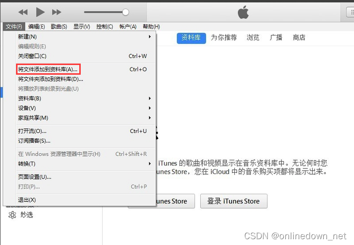 1.打开itunes软件,打开软件后,点击菜单栏的【文件】,在弹出的选项中选择【将文件添加到资料库】,然后找到您要制作铃声的文件。