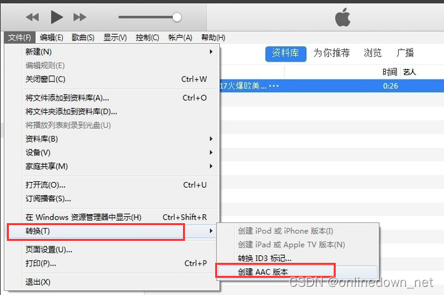 3、然后点击文件,在弹出的选项中选择【转换】,在二级菜单中点击【创建AAC版本】。