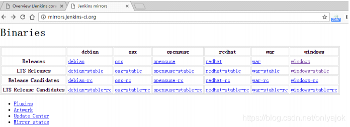 进入上面的地址,页面上有“Download Jenkins”的提示,点击后,可以下载war包,有两个版本 可选LTS版和每周发布版。