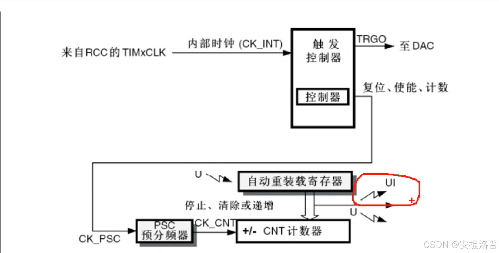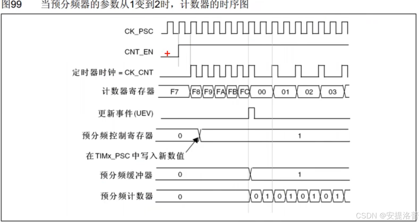 图中除了预分频计数器,还有一个预分频缓冲器,它是为了保证在一个计数周期还没结束时改变预分频值时,计数频率暂时不会改变,等到这个周期完成,下一个周期开始时再改变