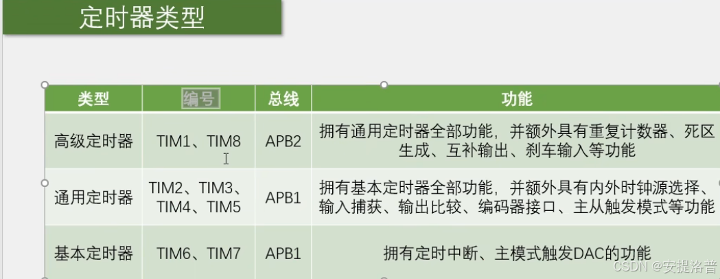 不仅具备基本的定时中断功能, 而且还包含内外时钟源选择、输入捕获、输出比较、编码器接口、主从触发模式等多种功能