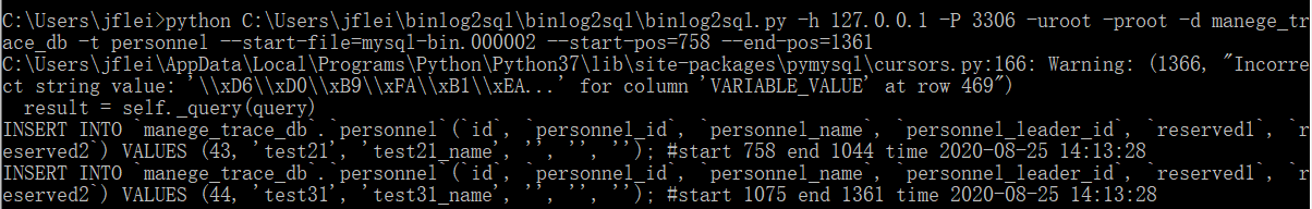python C:\Users\jflei\binlog2sql\binlog2sql\binlog2sql.py -h 127.0.0.1 -P 3306 -uroot -proot -d manege_trace_db -t personnel --start-file=mysql-bin.000002 --start-pos=758 --end-pos=1361