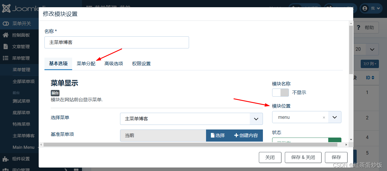 这里比较重要的是模块位置和菜单分配。 模块位置决定在页面的哪个位置展示,菜单分配决定这个模块在哪些页面展示。