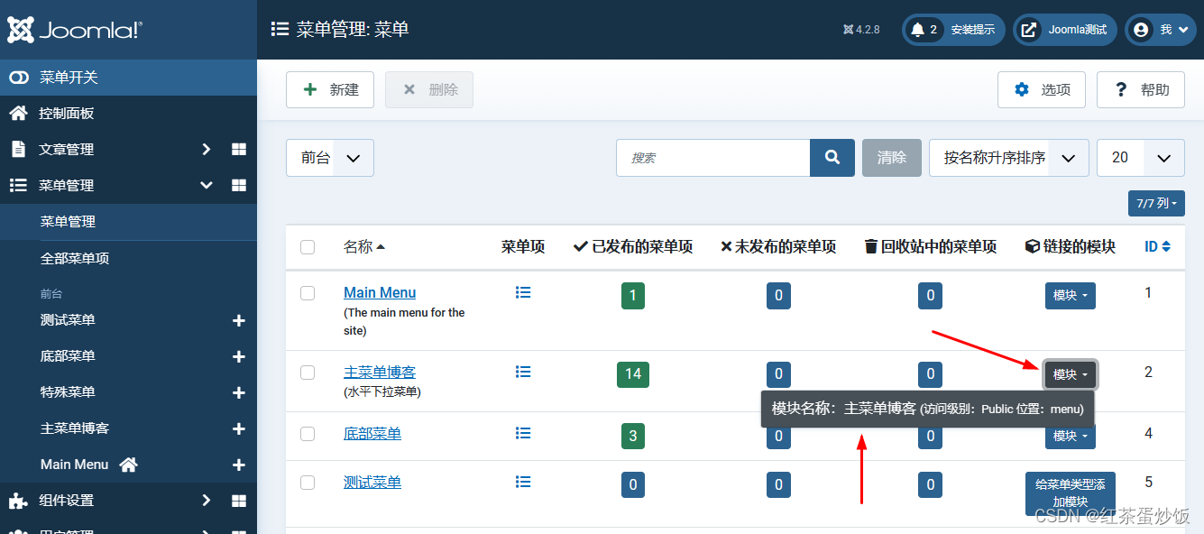 菜单的设置很简单,但是模块设置的操作有些奇怪。作为菜单模块输出的设置不是在每个菜单的设置页面,而是在菜单列表页面。在【链接的模块】列中,点击【模块】按钮,继续点击弹出的项目说明文字才会弹出对应的模块设置页面。