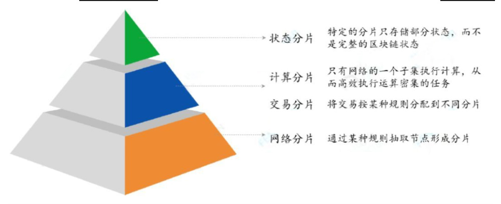区块链分片的层级由下到上分别为:网络分片(Network Sharding)、交易分片(Transaction Sharding)和计算分片(Computational Sharding)以及状态分片(State Sharding)。