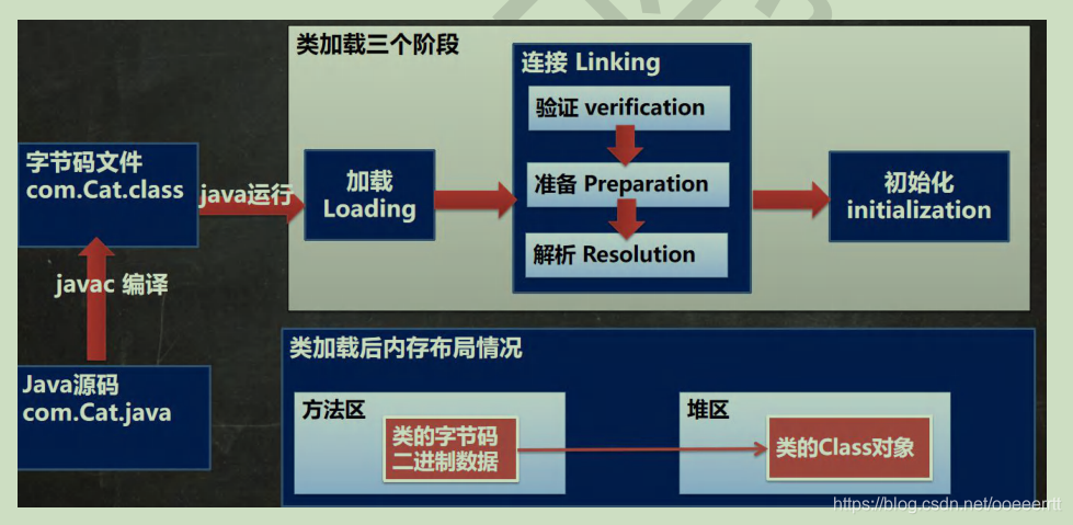 JVM在该阶段主要目的是将字节码从不同的数据源(class文件、jar包、网络等)转化为二进制字节流加载到内存中,并生成一个代表该类java.lang.Class对象。